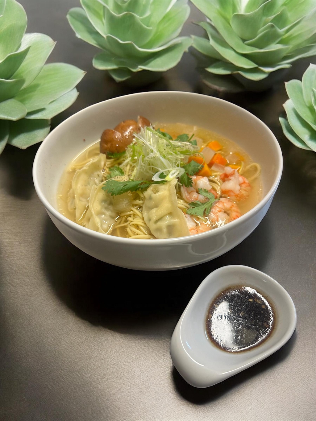 Poitrine Porc rôti croustillant, vermicelles frais, herbes parfumées et sauce nuoc-mâm maison. Un petit bol de soupe chaude est servi à part pour une expérience complète, légère et savoureuse.