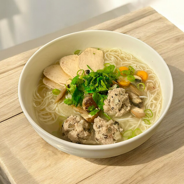 Un bouillon clair longuement mijoté, servi avec vermicelles de riz fins, poulet tendre et boulettes de porc haché aux champignons. Un plat réconfortant, léger mais riche en goût, idéal en toute saison.